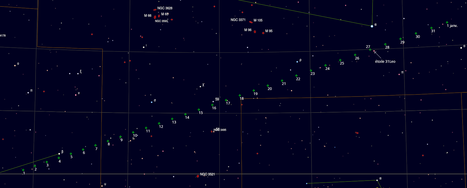 Les chiffres indiquent les jours du mois à 0h UTC (1h locale pour la France métropolitaine en heure d'hiver) donc par exemple pour le soir du 15 vers 5h30 heure française (4h30 UTC) l'objet sera positionné entre l'indication 15 et 16 plus rapproché du 15. Cette carte a été obtenue avec le logiciel "Cartes du ciel" avec les positions de l'objet calculées avec le service Horizons de la NASA/JPL que vous devriez utiliser pour obtenir la précision nécessaire à votre observation car le repérage risque d'être difficile.