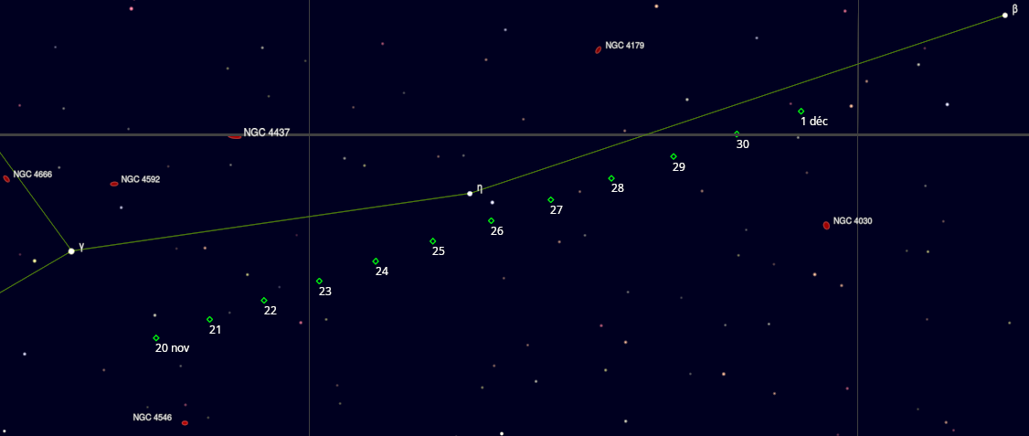 Les chiffres indiquent les jours du mois à 0h UTC (1h locale pour la France métropolitaine en heure d'hiver) donc par exemple pour le soir du 25 vers 5h30 heure française (4h30 UTC) l'objet sera positionné entre l'indication 25 et 26 plus rapproché du 25. Cette carte a été obtenue avec le logiciel "Cartes du ciel" avec les positions de l'objet calculées avec le service Horizons de la NASA/JPL que vous devriez utiliser pour obtenir la précision nécessaire à votre observation car le repérage risque d'être difficile.
